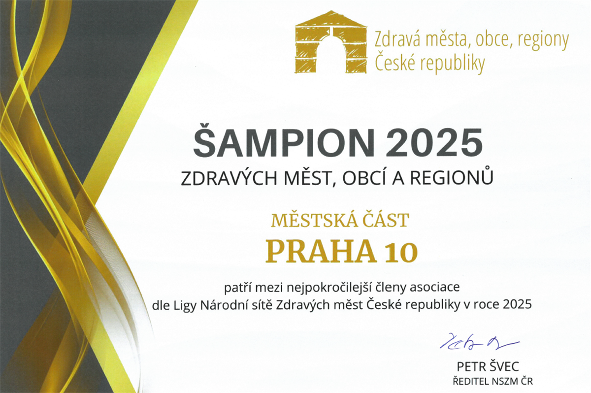 Městská část Praha 10 získala již popáté prestižní ocenění Šampion Zdravých měst, obcí a regionů. MČ Praha 10 tak opět potvrdila svou dlouhodobou pozici mezi lídry v oblasti udržitelného rozvoje, strategického řízení a aktivního zapojování veřejnosti. Nejvyššího hodnocení dosáhla poprvé v roce 2021 a od té doby jej každoročně úspěšně obhajuje po celé aktuální volební období.