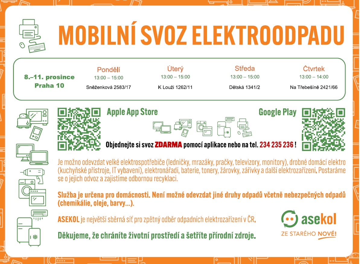 Informujeme o dalším kolu mobilních svozů, které na Praze 10 ve dnech 8. až 11. prosince zajišťuje kolektivní systém Asekol. Stejně jako v minulosti bude svozový automobil odpoledne k dispozici na stabilním místě, viz plakátek. V dopoledních hodinách (8-13) budou realizovány odvozy elektrozařízení přímo z domácností, dle objednávek od občanů. Akce bude probíhat od pondělí do čtvrtka.