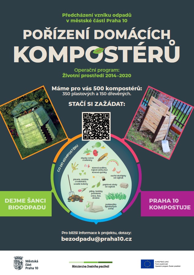 Městská část Praha 10 připravila projekt na předcházení vzniku odpadů formou podpory domácího kompostování. Projekt "Předcházení vzniku odpadů v městské části Praha 10 - pořízení domácích kompostérů." je spolufinancován z fondů Evropské unie prostřednictvím Operačního programu Životní prostředí 2014 - 2020 (Dotační akce č. CZ.05.3.29/0.0/0.0/19_122/0013098). Občanům MČ Praha 10 bude v rámci projektu bezplatně zapůjčen zahradní kompostér. Kompostéry budou předávány na základě „výpůjční smlouvy s následným darováním“ (návrh smlouvy je zpřístupněn níže). Výpůjčka je max. pětiletá a poté zůstává kompostér ve vlastnictví vypůjčitele. Tím je výhradně fyzická osoba. Schvalování žádostí bude probíhat postupně, jak budou doručeny, a s ohledem na příslušné náležitosti. Podmínkou projektu je umístění kompostéru na území MČ Praha 10 - tedy na katastrálním území Malešice, Michle, Strašnice, Vinohrady, Vršovice a Záběhlice (vždy pouze na části katastrálního území spadající do MČ Praha10) a po dobu udržitelnosti projektu jej využívat ke kompostování. Celkem bylo pořízeno 500 ks kompostéru o objemu 1000 litrů, část z nich jsou plastové (350 ks) a část dřevěné (150 ks). Distribuce kompostérů probíhá od listopadu 2021. Žádosti lze podávat elektronickou formou (případně i na základě osobní domluvy). Pro bližší dotazy k projektu je možné nyní využít emailový kontakt bezodpadu@praha10.cz.