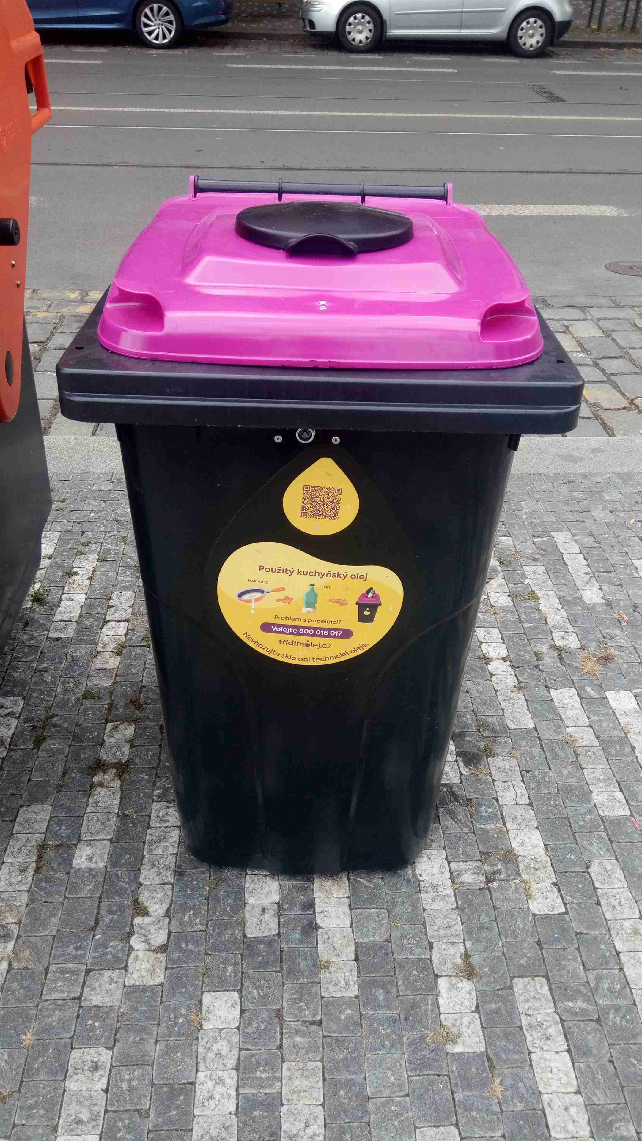 Svoz nádob probíhá jednou za dva týdny. Nádoba je černé barvy o velikosti 240 litrů s kruhovým vhozem ve víku fialové barvy. Bližší informace k třídění olejů jsou dostupné i zde: www.tridimolej.cz